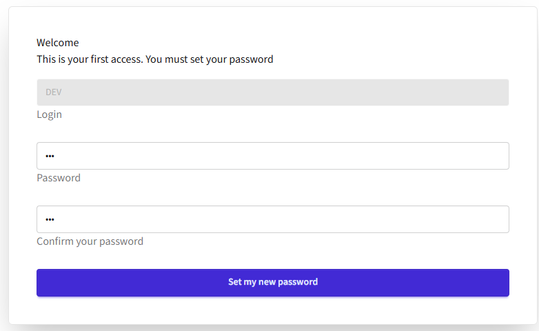 💡 The login for the first user automatically created by BWEB is mandatory DEV and you can choose your password.